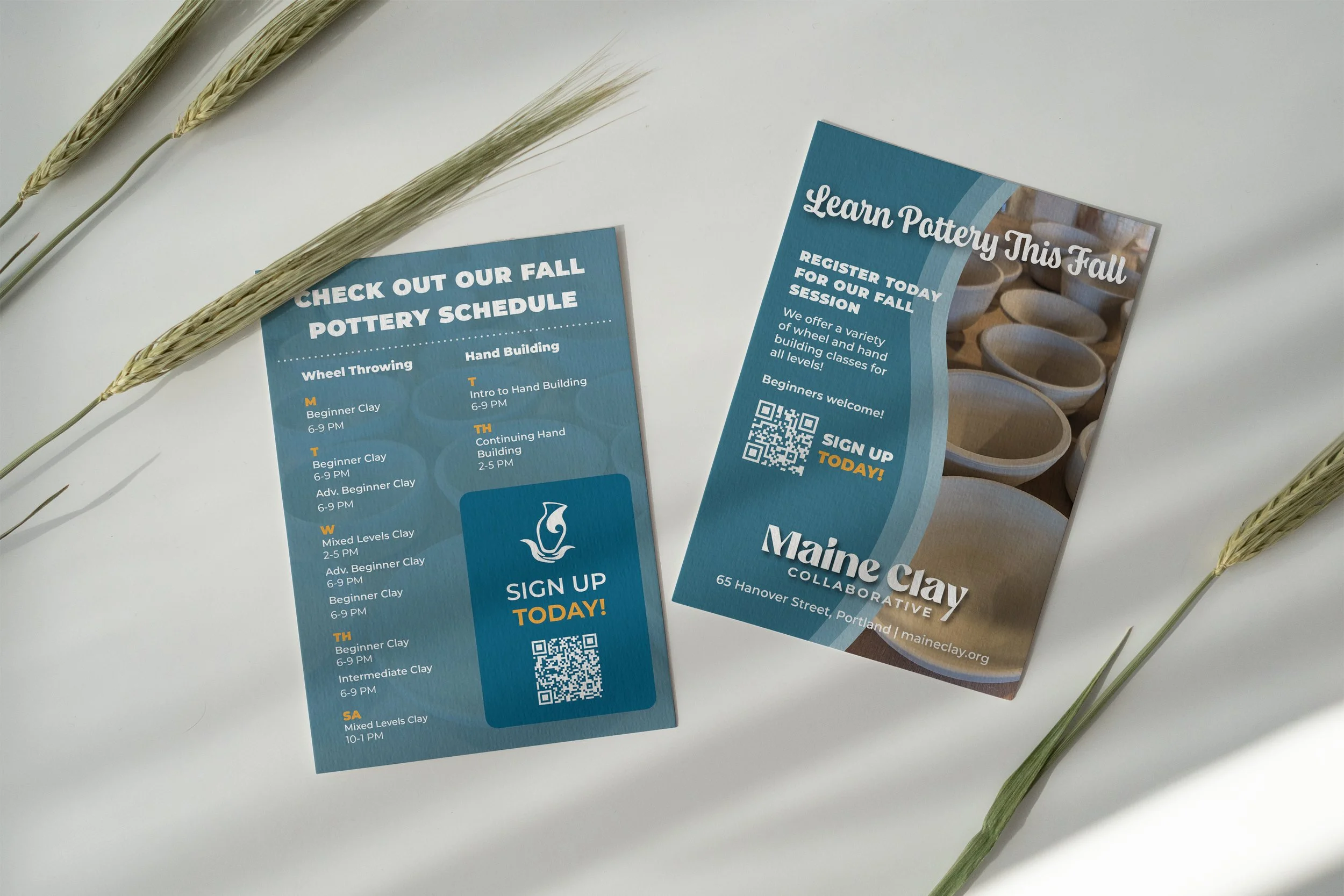 Some additional printed promotional work for Maine Clay Collaborative. These were all modified for social media as well. Below is a 5x7 postcard and to the right is an 11x17 poster advertising an upcoming workshop.
